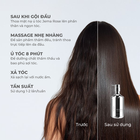 Mặt nạ tóc Jema Rose 8+ Minute Deluxe Repair Caviar Hair Mask sở hữu công thức giàu dưỡng chất, nổi bật với chiết xuất trứng cá muối (Caviar Extract) – nguồn cung cấp dồi dào protein, vitamin và khoáng chất, kết hợp cùng amino acids và vitamin A – B – D, giúp nuôi dưỡng toàn diện cả da đầu lẫn sợi tóc.