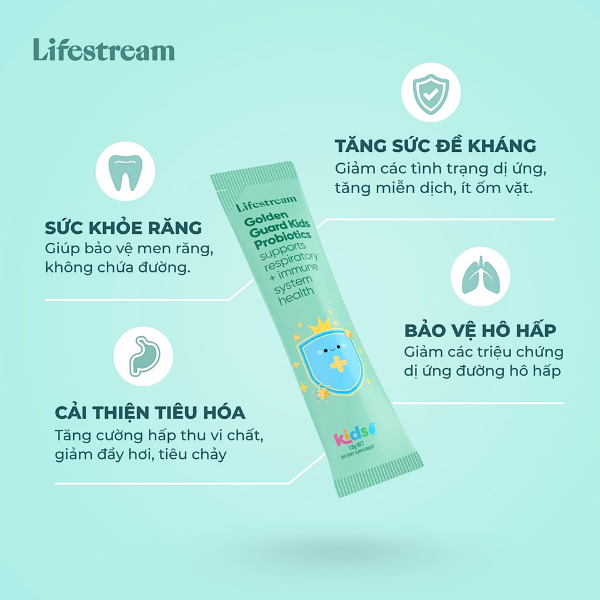Nếu bé hay bị hắt hơi, rối loạn tiêu hóa, ngứa mũi hoặc đỏ mắt thì rất có thể hệ vi sinh của con đang mất cân bằng và cần được hỗ trợ kịp thời. Men vi sinh Lifestream Golden Guard Kids Probiotic là giải pháp hỗ trợ tăng cường sức khỏe hô hấp, củng cố đề kháng và giúp răng chắc khỏe. Nhờ bổ sung lượng lợi khuẩn chất lượng cao, sản phẩm giúp ổn định hệ vi sinh đường ruột, hạn chế tái phát dị ứng và nâng cao khả năng miễn dịch từ bên trong cơ thể trẻ.