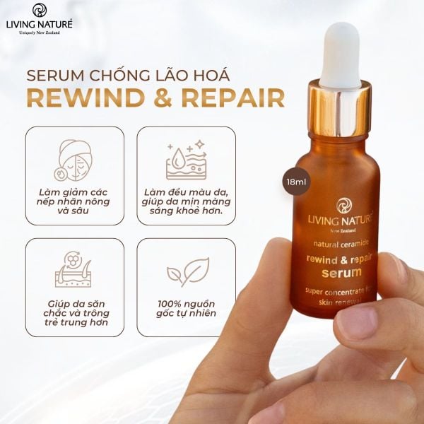 Serum phục hồi & tái tạo da Rewind & Repair từ nhà Living Nature chính là giải pháp toàn diện để giải quyết những nỗi lo này. Hãy cùng tìm hiểu chi tiết về bảng thành phần và công dụng thực tế của sản phẩm ngay dưới đây.