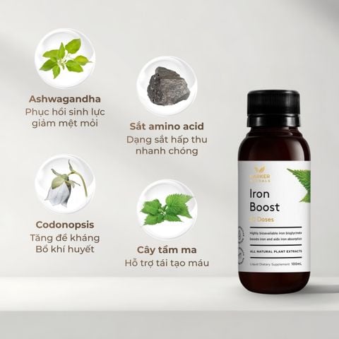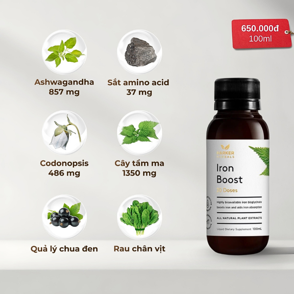 Để giúp cơ thể bổ sung nguồn sắt nhẹ nhàng và dễ hấp thu hơn, Harker Herbals phát triển Iron Boost dòng sản phẩm si-rô thực vật hỗ trợ trường hợp thiếu sắt hoặc thiếu máu do thiếu sắt. Công thức kết hợp sắt glycinate cùng thảo mộc - trái cây - rau củ giàu dinh dưỡng, giúp cơ thể hấp thu thuận lợi mà không gây táo bón hay để lại dư vị kim loại như nhiều loại sắt thông thường.