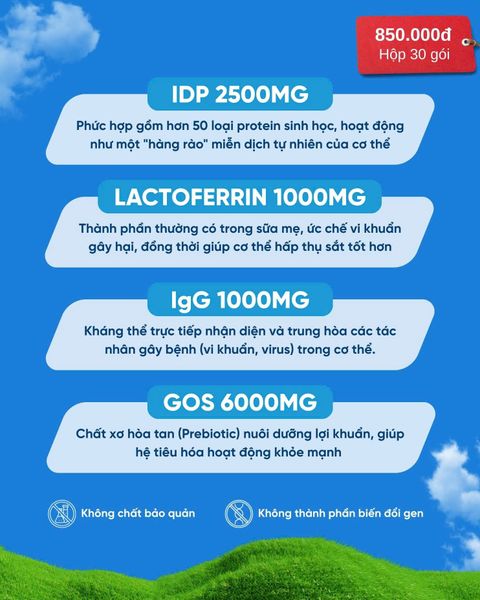 - IDP® (Immune Defense Proteins): 2500mg/100g - Đây là phức hợp gồm hơn 50 loại protein sinh học, hoạt động như một hàng rào miễn dịch tự nhiên của cơ thể.