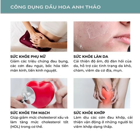 Dầu hoa anh thảo cung cấp nguồn GLA cô đặc (khoảng 7–10%), đã được nghiên cứu rộng rãi và sử dụng lâu đời trong hỗ trợ sức khỏe phụ nữ.